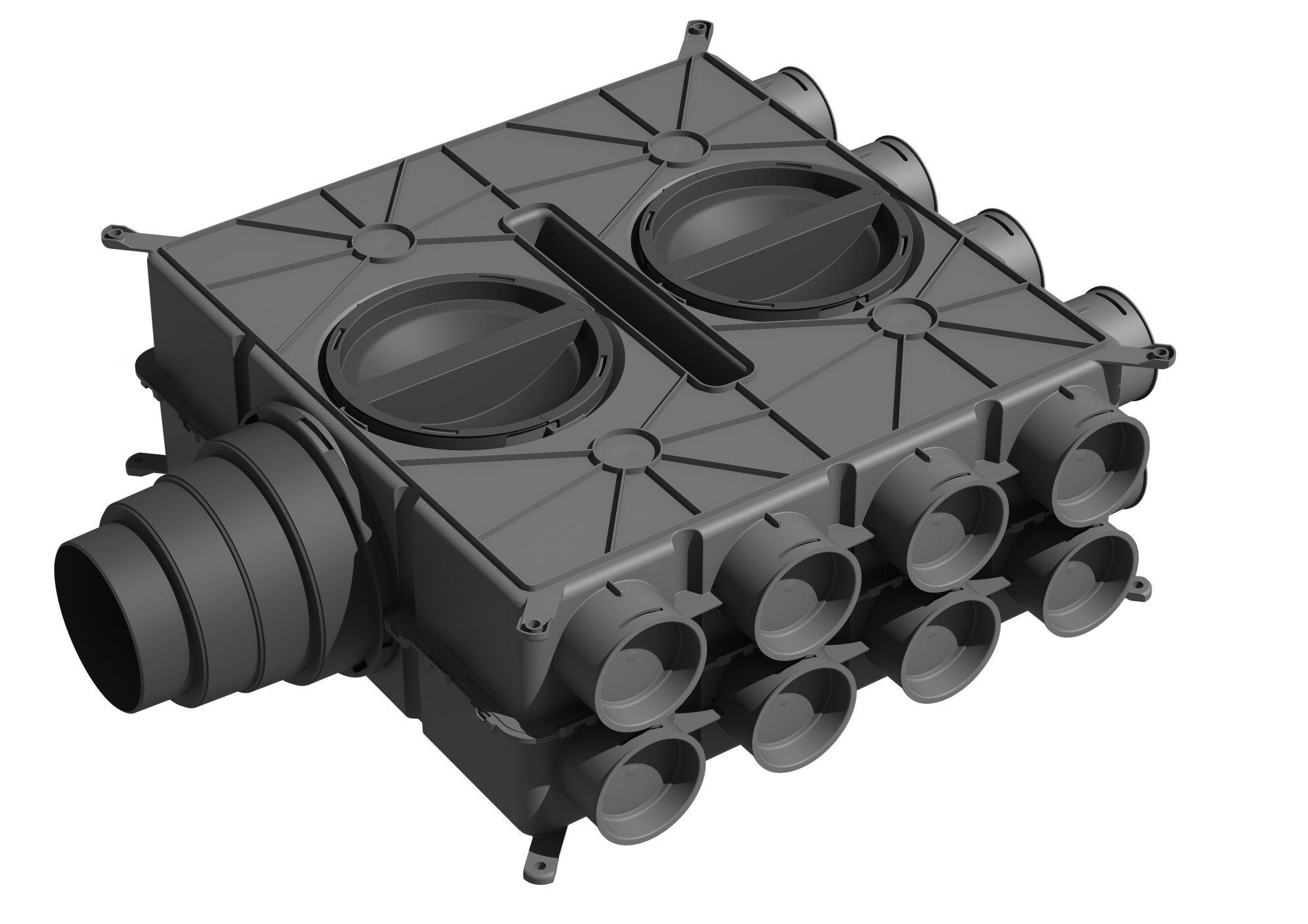 Воздухораспределительный коллектор для вентустановок CWL. Подключение: воздуховодов: 1 (универсальное) DN 125-180 + 16 DN 75. В комплекте 4 заглушки DN 75. Материал корпуса антистатический и антибактериальный полипропилен. Монтаж на стену или на потолок.